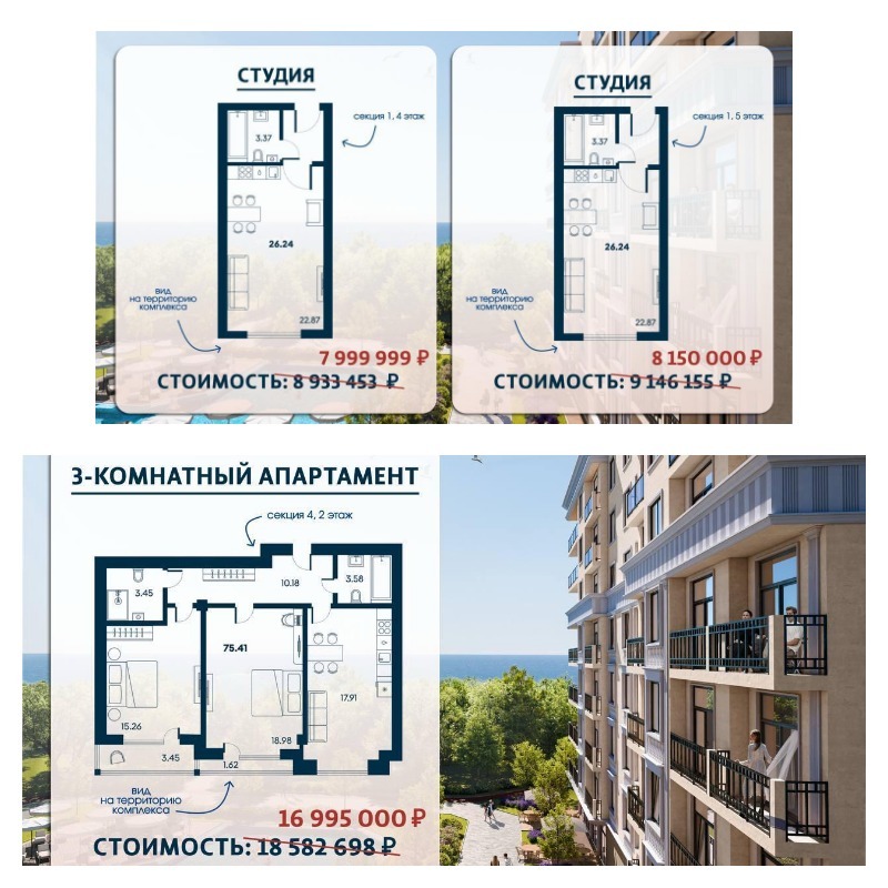 - Минимальный лот с видом на море — студия за 9 230 457 руб.