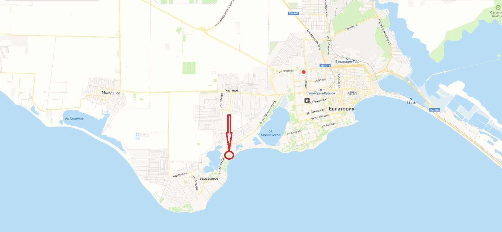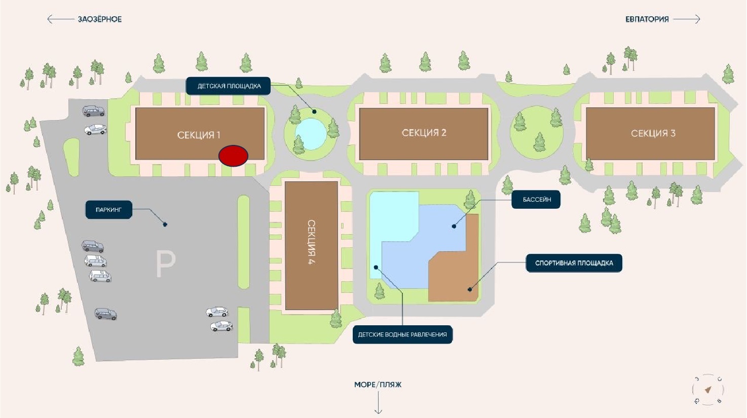 Комплекс строится в пгт Заозёрное, ул. Аллея Дружбы, 7 — всего 10 минут на автомобиле до центра Евпатории и 40 минут до аэропорта Симферополя.