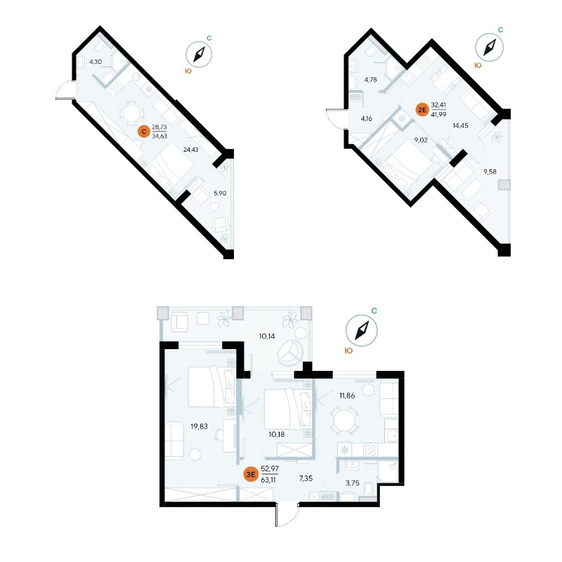 - 3-комнатные: от 63,1 кв.м до 105,9 м.кв