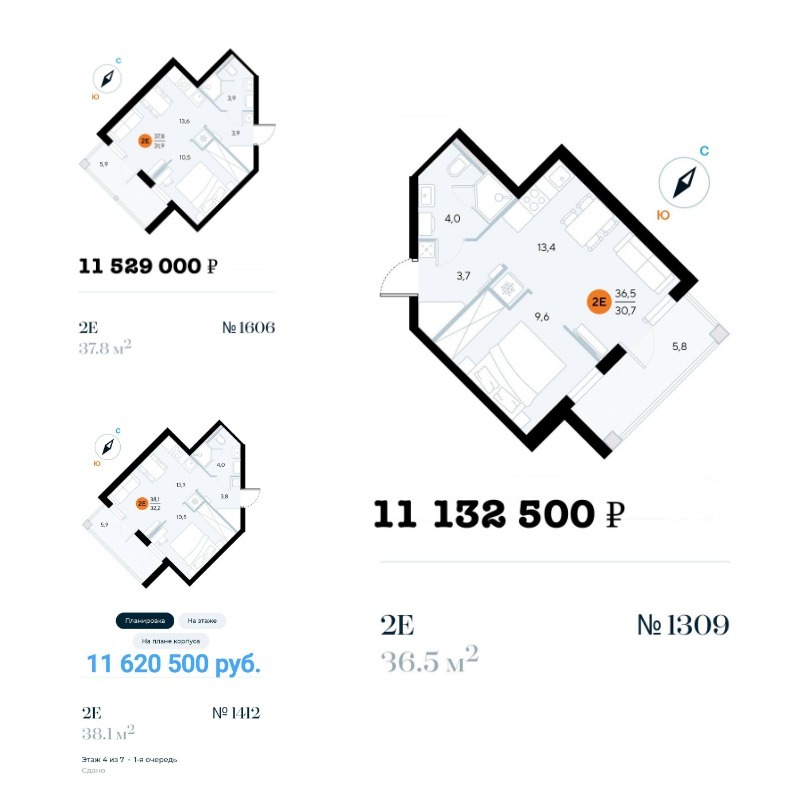- Двушка 42 м²: 12 809 424 руб. (304 986 руб./м²)